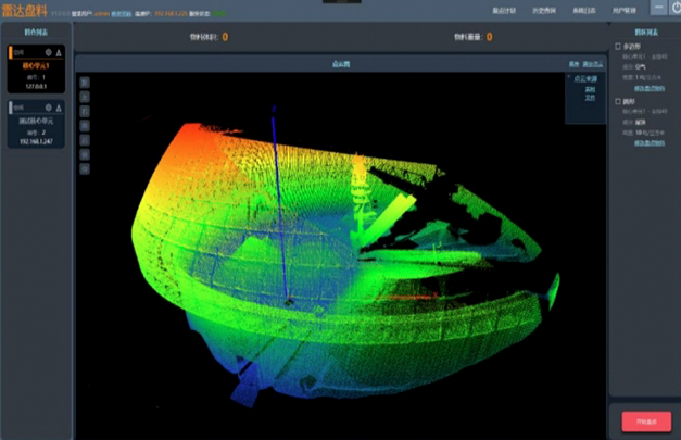 斗輪機(jī)盤料儀部署在斗輪機(jī)臂架兩端,內(nèi)置盤料儀嵌入式程序。通過臂架動 作帶動斗輪機(jī)盤料儀對其下方的料堆進(jìn)行掃描,同時(shí)從系統(tǒng)服務(wù)器實(shí)時(shí)獲取斗輪 機(jī)的走行位置、旋轉(zhuǎn)角度、俯仰角度及臂架的旋轉(zhuǎn)方向等維度定位數(shù)據(jù),將掃描 數(shù)據(jù)轉(zhuǎn)換為料堆的三維坐標(biāo)點(diǎn)數(shù)據(jù),并將獲得的三維坐標(biāo)點(diǎn)信息上傳至雷達(dá)應(yīng)用 單元進(jìn)行處理.....